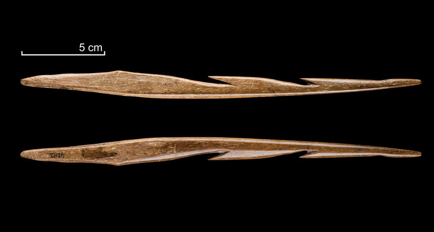 BEE STICKY Chemical analyses show that a barbed bone point from Germany dating to around 13,000 years ago, shown from two sides, contains remnants of a beeswax glue near its base, left. Either honeybees entered northern Europe earlier than thought, as glaciers retreated, or beeswax was traded over long distances, scientists say.