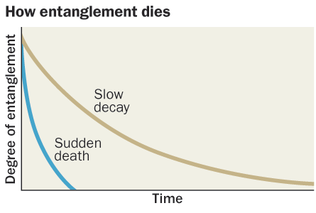 Scientists studying how entanglement changes over time have found that the effect can fade away or disappear suddenly, as shown below.