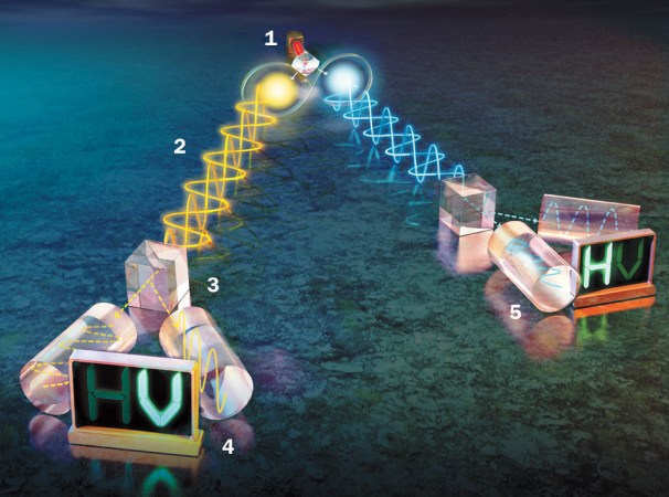 The researchers thought that this entanglement would be so fragile that the photons would be lost to the noisy telecom environment in the wires. But the entangled photons survived the trip, the team reported online July 22 in Applied Physics Letters. “It’s very easy to put the quantum signal on top of the telecom signal, and pick it off again,” Jennewein says.