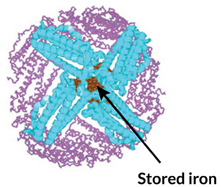 TUCKED AWAY A spherical protein called ferritin can store iron safely in an interior pocket, keeping the element from reacting with other compounds inside cells. T.A. Rouault/Nature Reviews Neuroscience 2013