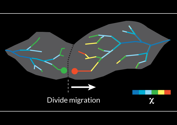RUNNING WATERS When a value called χ varies across watershed boundaries, as it does along the crest of the Blue Ridge Mountains (thick white line), the river networks are still evolving and the ridge is shifting, a new study shows.