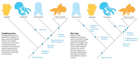 The notion that comb jellies may elbow out sponges from the base of the animal tree of life is a radical one. If true, it means that comb jellies evolved nerves, muscles and other complex features, which in some ways resemble our own, independent of the ancestor that led to most animals.
