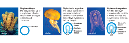 In traditional trees of life, the sponges branch off first, as multicellular animals without much specialization. Jellyfish, sea anemones and corals are thought to come later, from an ancestor with multiple cell types, and some cells organized into an outer layer of tissue surrounding the body and an inner tissue layer lining the gut. An animal with all these features plus nerve cells, a rudimentary brain and a middle tissue layer that forms muscles is traditionally thought to have given rise to comb jellies and the rest of the animals.