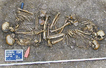 After the attackers left, villagers returned to find their compatriots murdered. Four large graves were dug close together, each containing a carefully arranged group of two to four people. Genetic evidence, published in the Proceedings of the National Academy of Sciences in 2008, suggests that one grave held a nuclear family — a man, a woman and their two children. The man was placed beside an 8- to 9-year-old boy, while the woman was next to a 4- to 5-year-old boy.