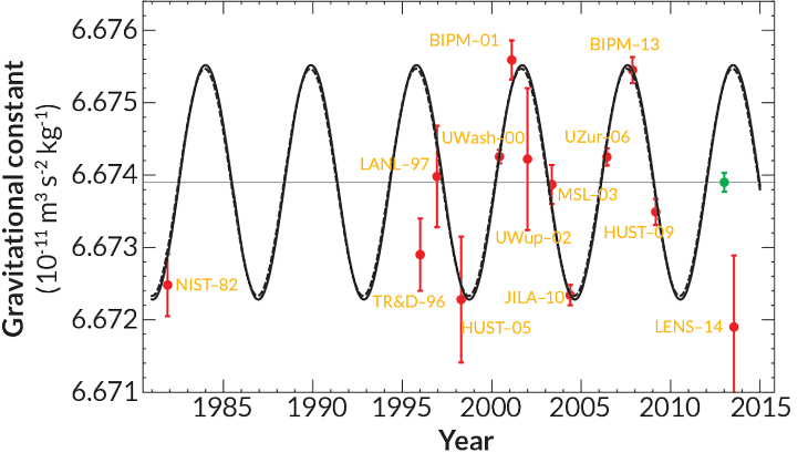 The study impressed Stephan Schlamminger, a metrologist at the National Institute of Standards and Technology in Gaithersburg, Md. But when he looked for his 2001 G-measuring experiment on the graph, he found the dot placed in 2006, the year he published a paper about the result. Anderson says he did his best to determine the dates of each experiment, but many studies don’t specify when the work was done.