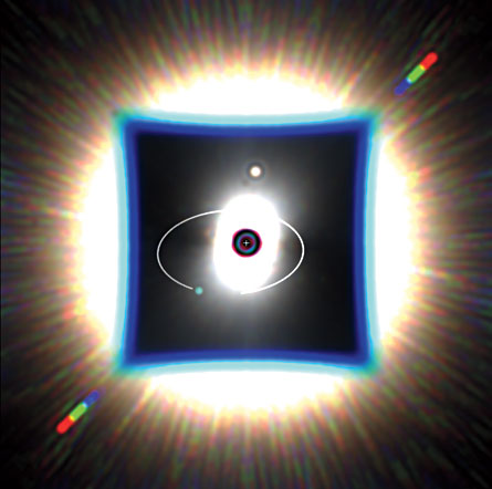 Astronomers always knew it would be a challenge to take a picture of an extrasolar planet, or exoplanet. Even a young orb, still warm and relatively bright from its birth inside a swirling, circumstellar disk of gas and dust, is only one-hundred-thousandth to one-millionth as luminous as its parent star. Imaging such a planet is like trying to find a firefly caught in the glare of a nearby searchlight. Observers have used coronagraphs — masks on telescopes that block the light of a star — to search for faint planets orbiting the star. But these masks aren’t tailored to the search for extrasolar planets, and the optics may not be precise enough to create a sufficiently sharp image. As a result, stray starlight can scatter or spread out from the mask, creating a lumpy halo of light. In the image, the lumps would appear similar in size to the planet.