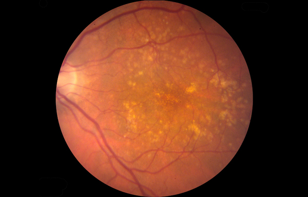 Macular degeneration comes in two forms, dry and wet. In the dry, early stage of the disease, cells in the center of the retina die, blurring vision. This stage is often characterized by yellow clumps of lipids, including cholesterol, in the retina. These deposits can be a warning sign that a person is at risk of developing the wet form of the disease, in which blood vessels invade the back of the eye and leak, killing retinal cells. Patients are left with a hole in the middle of their field of vision.