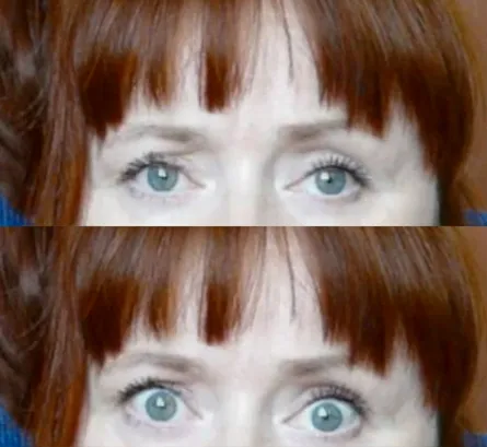 Compared with her normal state (top), a woman’s “hypnotically induced stare” (bottom) may mark an altered state of consciousness, researchers propose.