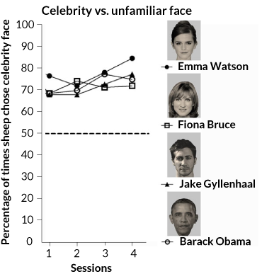 To see if the sheep were just memorizing shapes, researchers did the same test, but with pictures in which the celebs’ heads were tilted right or left. The sheep didn’t do as well but still passed, recognizing the celebrities about 67 percent of the time on average — a drop in performance comparable to that seen in humans performing the same task.