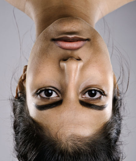 At first glance, a test’s upside-down portrait comes across as no more than a flipped version of an ordinary person. Rotating the image right-side-up, however, creates a growing queasiness that turns B movie–gruesome as the brain can finally perceive the details properly. The eyes and mouth sit upside down relative to the rest of the face. Even partly right-side-up, a face that hadn’t been disturbing now looks nightmarish.