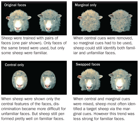 In the classic test of distinguishing between upside-down pictures of faces of their own breed, sheep showed the diagnostic dip in performance that people and chimps do. Yet for pictures of buckets or portraits of an unfamiliar sheep breed, right-side-up versus upside-down didn’t make much of a difference.