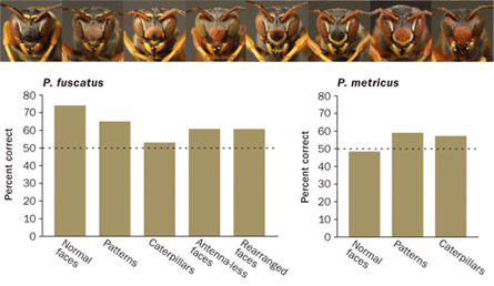 In the study, the paper wasps learned to distinguish between two faces faster than they learned about geometric patterns or other pictures. Jumbling the features slowed down the learning and destroyed any particular advantage wasps normally showed in face learning. Thus, wasps too must have their own version of a specialized face-recognition system, conclude Tibbetts and Sheehan.