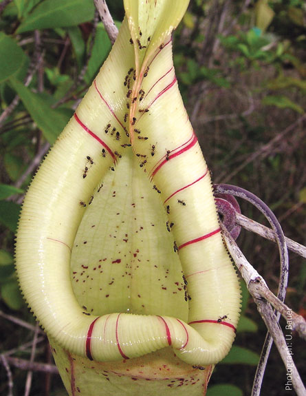 DRY MOUTH When the lips of pitcher plants’ traps are dry, ants can swarm over them without slipping in.