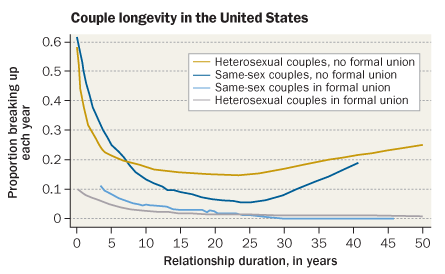 Heterosexual and gay couples who make public vows — either in marriage ceremonies, upon forming legal domestic partnerships or on their own initiative — report low breakup rates that fall to near zero among couples who have lived together for at least 20 years, Rosenfeld finds. Couples that don’t make public commitments to their relationships split at much higher rates.