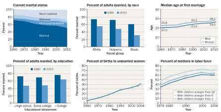 Census and survey data for 2010 show that only half of U.S. adults age 18 or older are married, a proportion that has steadily declined from 72 percent in 1960. Marriage rates have plummeted most dramatically among 18- to 24-year-olds and among adults without college degrees, mostly from lower- and middle-class households. With marriage in retreat, other living arrangements — unmarried adults cohabiting with or without children, single people living alone, single parents raising children, to name a few — are on the rise.