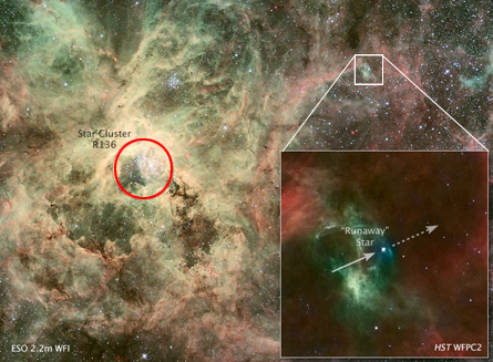So even though 30 Doradus 016 is extraordinarily heavy, it nonetheless must have been the wimpiest member of a stellar trio in 30 Doradus. The two heavier stars in the trio gravitationally ganged up on 30 Doradus 016, kicking it out, Walborn and Evans explained in a May 3 presentation at a symposium on star formation and evolution at the Space Telescope Science Institute. Their team, which also includes Paul Crowther of the University of Sheffield in England, details its study of the runaway star in the June 1 Astrophysical Journal Letters.