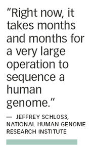 “Right now, it takes months and months for a very large operation to sequence a human genome,” Schloss says. He adds that deciphering a sequence, while minimizing errors, costs about $5 million. That amount pays for skilled technicians, expensive chemicals, automated machines, and sometimes high-power cameras to detect tiny light flashes.