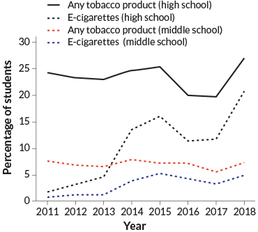 The flavor restrictions coincide with the release of new data showing that e-cigarette use by high school students shot up 78 percent from 2017 to 2018. The data, part of the National Youth Tobacco Survey, were reported November 16 in the Centers for Disease Control and Prevention’s Morbidity and Mortality Weekly Report.
