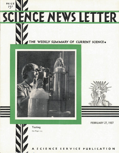 By checking the accuracy of deep-sea thermometers, Miss Grace Gowens of the Bureau of Standards aids the scientist to determine accurately the temperature of the sea at great depths. The freezing point of the thermometer is determined with the apparatus shown in the picture on the front cover of this week’s Science News Letter. The thermometer is placed in the ice for half an hour and then turned quickly, or “flipped.” The “flipping” causes the mercury column to break at a constriction and registers the temperature until disturbed. Melting ice has a temperature of 0° C. (32° F.) and is, therefore, a good standard.