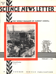 The picture of building activity on the cover shows the San Francisco anchorage for suspension cables as it rises to its full 68,000-cubic-yard stature. Steel grillage and eyebars, to which the 28-inch diameter cables will be attached, are being embedded in the concrete. The monolith will be 160 feet high, 108 feet wide, and 184.6 feet long and is being cast sectionally in interlocking blocks to offer greatest resistance to the pull of the cables.