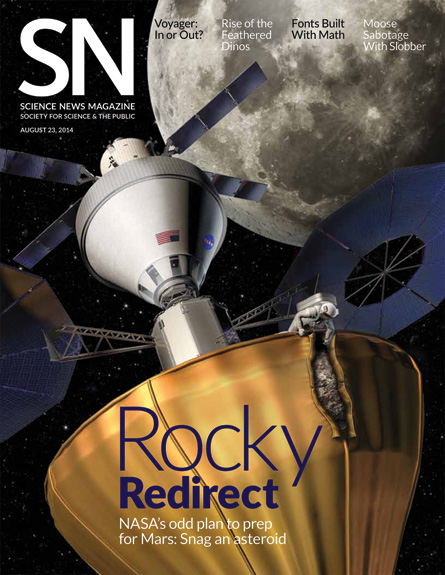 NASA plans to nab an asteroid and bring it into orbit around the moon. The mission is billed as a stepping stone to Mars, but critics question whether redirecting space rocks will help put humans on the Red Planet. Meghan Rosen detailed the debate in “A rocky road to Mars” (SN: 8/23/14, p. 22).