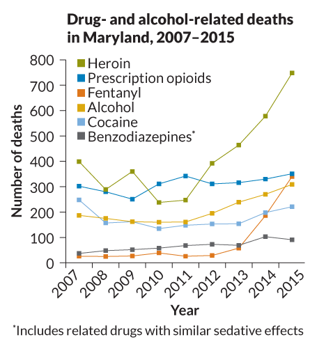 Maryland is one of the hardest-hit states. From 2007 to 2012, the number of fentanyl-related deaths hovered around 30 per year. By 2015, that number had grown to 340. A similar rise is obvious in Connecticut, where in 2012, there were 14 fentanyl-related deaths. In 2015, that number was 188.