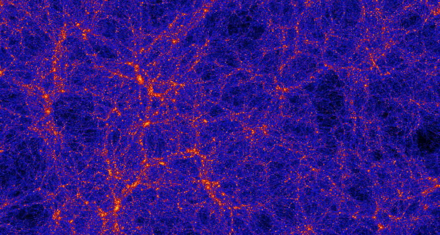 GIANT STRUCTURES The cosmic web shows dark matter filaments and intersections where galaxies reside, in a computer simulation.
