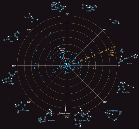 EXTRATERRESTRIAL SURVEILLANCE Eighty-two known stars (blue dots) within 3,500 light-years of Earth could host advanced civilizations that can see Earth cross in front of the sun.