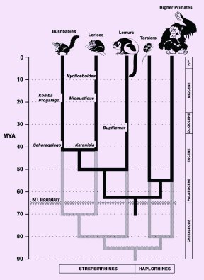 TANGLED TREE. Primate evolutionary diagram shows the two main living groups, strepsirrhines and haplorhines, with known fossil forms of strepsirrhines. Traditional model of primate evolution (dark lines) contrasts with DNA-based version (shaded lines).