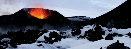 Iceland is an ideal place to see icy volcanoes and for scientists to figure out how such volcanoes work. The country has some two dozen active volcanoes, of which Eyjafjallajökull is relatively puny. The island is so volcanically active because it is the above-water manifestation of the Mid-Atlantic Ridge, the chain of mountains that runs down the center of the Atlantic like an underwater backbone. Here Earth’s crust pulls apart, and upwelling magma cools and forms new crust that spreads away from the ridge in the great recycling process known as plate tectonics. Iceland is geology in action; a one-hour flight from Reykjavik skims over steaming geothermal areas, the great crustal rift and some of the country’s most famous volcanoes.