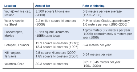 The disappearance of ice sheets lifts weight off the land, he says, and great pieces of Earth’s crust can rise with their backs unburdened. Many regions in northern latitudes, such as Scandinavia and Canada, are still uplifting from the pressure released when the great ice sheets retreated at the end of the last ice age. In Iceland, where an ice sheet some 300 kilometers wide has mostly disappeared, this “glacial rebound” is as much as 20 millimeters per year. In addition, glaciers worldwide are retreating because of rising global temperatures. Ice caps in Iceland, for example, have been thinning since around the year 1890.