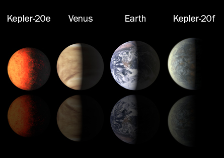 The first two Earth-sized exoplanets, Kepler-20e and Kepler-20f, are depicted here compared to Earth and Venus.