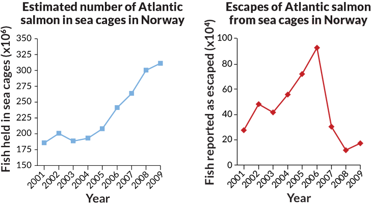 Technical improvements could help. The Norwegian government rolled out a marine aquaculture standard in 2004 that required improvements, such as engineering nets, moorings and other equipment to withstand unusually strong storms. Compared with the period 2001–2006, the average number of Atlantic salmon escaping annually from 2007–2009 dropped by more than half. Ocean Farm in Ecuador has tightened security, increased cage inspections and switched to stronger net materials; no cobia have escaped since last year’s break-in, says Samir Kuri, the company’s operations manager.