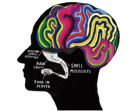Flavorama is split into sections that each feature one of Johnson’s laws of flavor. After establishing that “Flavor is molecules,” she moves on to “Flavor is taste and smell.” Smell, perhaps counterintuitively, often influences flavor more than taste does, thanks to the numerous smell receptors, she explains. Smell can also evoke emotional memories more intensely than other sensory inputs. Hand-drawn illustrations of the human brain and nasal cavity explain why by showing how nerve cells that line the roof of the nasal cavity detect scent molecules and send signals directly to the limbic system, a part of the brain that handles feelings and memories. Other sensory inputs, in contrast, are first processed in different parts of the brain before arriving at the limbic system.