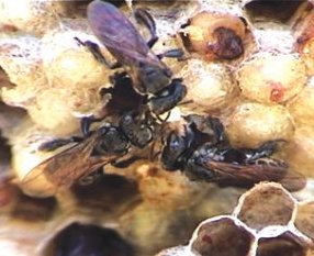 This stingless bee, Trigona hypogea, carries off the youngsters left behind in newly abandoned wasp nests, says Fernando Noll of the University of São Paulo in Brazil. He and his colleague Sidnei Mateus have observed the bees swiftly cleaning out wasp broods. In an upcoming Naturwissenschaften, the researchers contend that such efficient raiding is “not aberrant behavior, but is merely a lesser known part of the bees’ normal repertoire.”