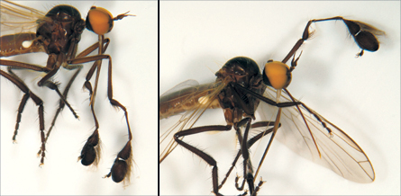 FLY GUYS Foreleg fashions vary for males of a newly named species of dance fly that grows balloonlike ornaments, sometimes on both legs (left), sometimes on one (right) or none.