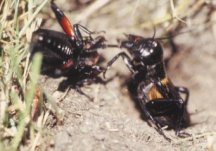 When male crickets meet, the encounter is usually not friendly. The insects first fence with their antennae. The fight intensifies as the competitors bare and lock their mandibles and then wrestle until one cricket knuckles under. The contest can end whenever one of the competitors gives up and runs away.