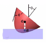 A paraboloid with a very low relative density will float with its base parallel to and just below the fluid surface. As the relative density increases, the paraboloid sinks into the liquid, then begins to tilt. At a critical density and tilt angle, its base becomes only partially submerged, and the paraboloid topples onto its side.