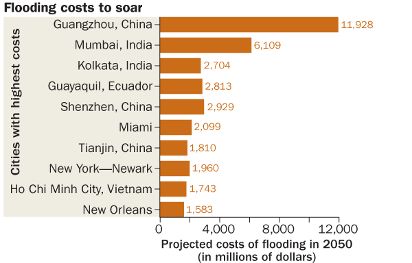 In 2005, annual flood losses for the coastal cities came to $6 billion. A team of economists and scientists considered the impacts of factors such as sea level rise and economic and population growth, noting that floods will become increasingly costly. So even if cities beef up protective measures such as dikes and levees, total flood damage will cost $60 billion to $63 billion by 2050, the authors report August 18 in Nature Climate Change.