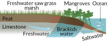 Because it is underground, the saltwater intrusion zone is not visible on a map. “But you can see the legacy effect … above ground,” says wetland ecologist Stephen Davis of the Everglades Foundation, a nonprofit group based in Palmetto Bay, Fla. “The salinity periodically knocks back the plant community.”