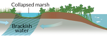 Over the last half-century, the freshwater-saltwater transition zone in the Everglades has moved inland by at least a kilometer, due both to rising sea levels and to the reduction of freshwater flow through the Everglades. Some scientists call this inland shift of saltwater the Anthropocene Marine Transgression, a nod to the fact that humans are ultimately responsible for the rising seas and freshwater management.