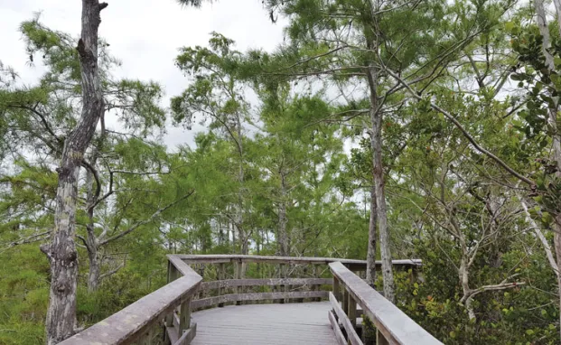 The boardwalk at Pa-hay-okee Overlook is a brief, winding path into a dreamworld in Everglades National Park. Beyond the wooden slats, an expanse of gently waving saw grass stretches to the horizon, where it meets an iron-gray sky. Hardwood tree islands — patches of higher, drier ground called hammocks — rise up from the prairie like surfacing swimmers. The rhythmic singing of cricket frogs is occasionally punctuated by the sharp call of an anhinga or a great egret.