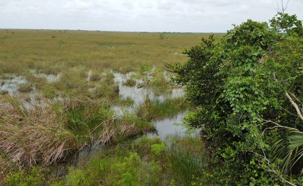 Hardest hit is the ubiquitous saw grass. Saw grass is hardy stuff; it is resistant to wildfires and thrives even in nutrient-poor soil. But saltwater is another matter. In 2000, a team of scientists surveyed the southernmost portion of the Everglades from the air. The researchers noted odd pockmarks dotting the land — bare patches where the saw grass had died. “Some of these landscapes look like Swiss cheese,” Davis says.