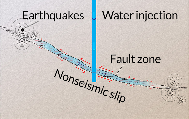 This diagram shows how water pumped into a seismic fault triggered smooth slipping near the injection site and small earthquakes farther along the fault. The slipping may be responsible for building up the stress that provoked the quakes, researchers propose.