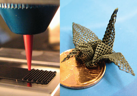 Lewis’ fabrication technique depends on direct-write assembly, in which a small nozzle deposits ink containing metal or ceramic particles directly onto a substrate. By mixing solvents with the ink, her team creates sheets that dry only partially. As long as the ink has some solvent, the material remains plasticlike; it can be folded, unfolded and refolded again and again.