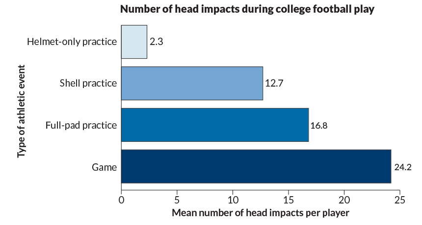The severity of hits was reduced in helmet-only practices compared with the other categories, where it held steady. Head hits, even those not severe enough to cause concussions, can cause brain trouble.