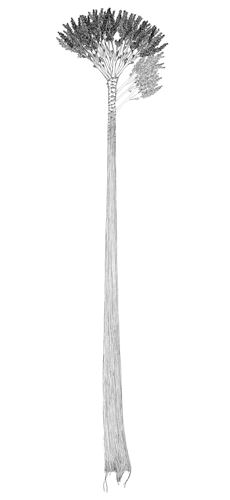 The other fossil is much shorter but contains the critical evidence that links Eospermatopteris to Wattieza, says Stein. The thicker end of this log bears scars where branches had once grown, but the crown of the plant retains branches that were alive when the tree fell. Each branch was about 1 m long and 6 cm across at its base, says Stein. Instead of having leaves, the branch just divided as it grew, and then divided again and again. The end of a mature branch looked like a bottle brush.