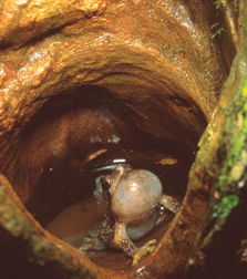 That object is a tree with a cavity holding a puddle of water. Courting males of Metaphrynella sundana sit partly submerged in these puddles while chirping nighttime advertisements for females. When starting his call, the male raises and lowers the pitch until it hits the frequency that resonates in his particular cavity. Then he lengthens individual calls and shortens the time between them as he settles down for serious chirping, report Lardner and Maklarin bin Lakim of Sabah Parks Research and Education Division in Malaysia.
