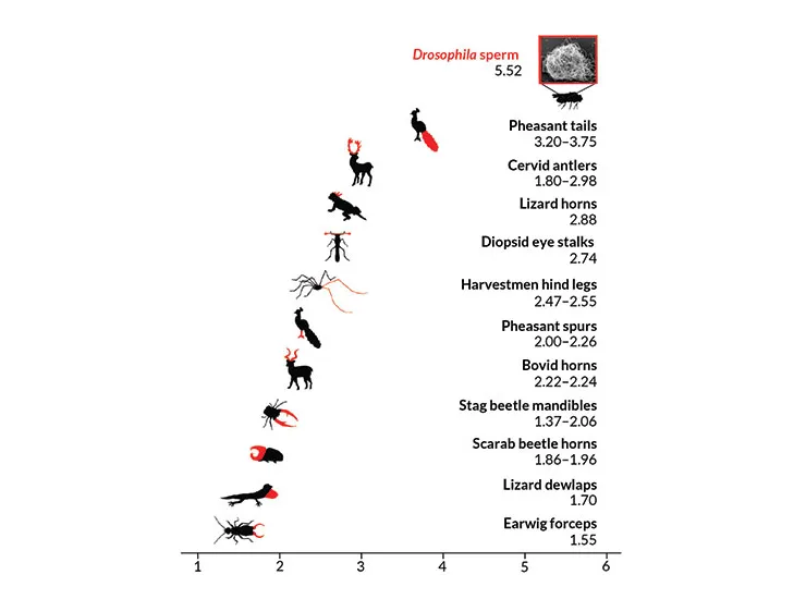 EXTREME SPERM The most oversized male sexual feature yet documented may be a fruit fly’s giant sperm (right, one sperm at 200 times magnification from Drosophila bifurca; left, same magnification of male surrounded by a male reproductive tract).