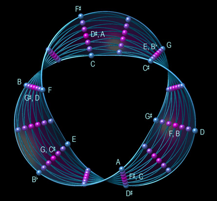 Familiar relationships between sets of musical notes, such as transposition between chords, directly translate into geometrical structures such as this Möbius strip — where each dot represents a whole class of equivalent two-note chords — or into more complex structures with many dimensions.
